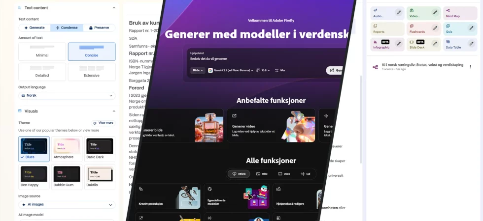 Copilot og ChatGPT er nyttige verktøy, men til mange oppgaver finnes det andre KI-verktøy som er bedre. Her er tre av mine favoritter. Adobe Firefly Firefly er både en app og navnet på Adobes generative bilde- og videomodeller, men det er appen jeg skal fokusere på her. Fra å være en ganske standard app for bilde- og videogenerering med Adobes egne modeller, har Firefly utviklet seg til å bli et kraftig verktøy som samler det beste fra alle de andre KI-gigantene i et felles grensesnitt. Adobe lar deg generere bilder, vektorgrafikk, lyd og video. I tillegg kan du blant annet...