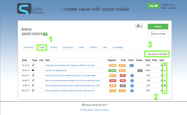 Når du har merket alle postene du vil ha med i kampanjen, så klikker du på ‘Add posts to campaign’ øverst i postlisten (3).