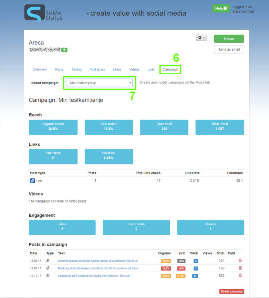 Nå kan du velge fanen ‘Campaign’ (6). I valgboksen øverst på fanen kan du velge den kampanjen du vil analysere (7). Da får du opp analyse av rekkevidde, linker, videoer, engasjement og de enkelte postene som er med i kampanjen.