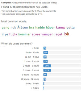 Den store nyheten i årets analyse er en egen kommentar-analyse. Facebook annonserte tidligere i år at aktivt engasjement ville være avgjørende for rekkevidden til Facebook-sider. De definerte aktivt engasjement som «at mennesker snakker sammen om innholdet». Det vil si at kommentarer fra publikum, og spesielt kommentarer som andre brukere svarer på, vil være viktig for rekkevidden din i år. Hvor mye aktivt engasjement du har på postene dine får du svar på i halvårsanalysen på SoMeStatus.com.