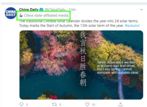 En rekke kinesiske medier er merket som «China state-affiliated media». Blant disse er Global Times, CCTV og Peoples Daily. Twitter merker også kontoene til redaktører og ledende journalister i disse mediene.