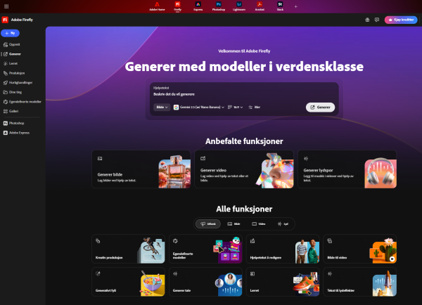 Firefly er både en app og navnet på Adobes generative bilde- og videomodeller, men det er appen jeg skal fokusere på her. Fra å være en ganske standard app for bilde- og videogenerering med Adobes egne modeller, har Firefly utviklet seg til å bli et kraftig verktøy som samler det beste fra alle de andre KI-gigantene i et felles grensesnitt.