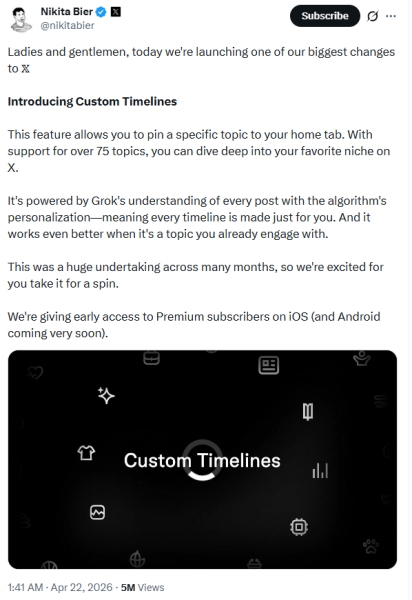 X lanserte tema-feeder styrt av KI. Custom feeds er en ny funksjon på X, hvor du kan velge mellom over 75 ulike tema-styrte feeder. Det er KI-modellen Grok som styrer algoritmene i tema-feedene, og velger hvilke poster du får se. I første omgang er Custom feeds tilgjengelig til iOS-brukere som betaler for X Premium, men støtte for Android skal være like rundt hjørnet.