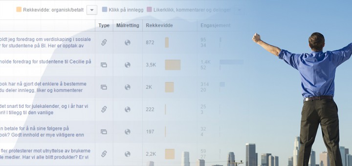 Oppdatert 04.07.2017 Sosiale medier har blitt en viktig markedskanal for mange bedrifter, og viktigst av alle er Facebook. Men Facebooks popularitet gjør at det blir stadig vanskeligere å vinne kampen om brukerens oppmerksomhet. Facebook har en komplisert formel som bestemmer hva hver enkelt bruker ser i nyhetsstrømmen, og utfordringen er å komme gjennom dette stadig trangere «nøkkelhullet». Mange «eksperter» påstår at det nå er umulig for bedrifter å nå ut til brukerne uten å betale, og enkelte hevder at man bare når 6% av de som følger siden. Det er tull! Gjør du en OK jobb på Facebook, så...